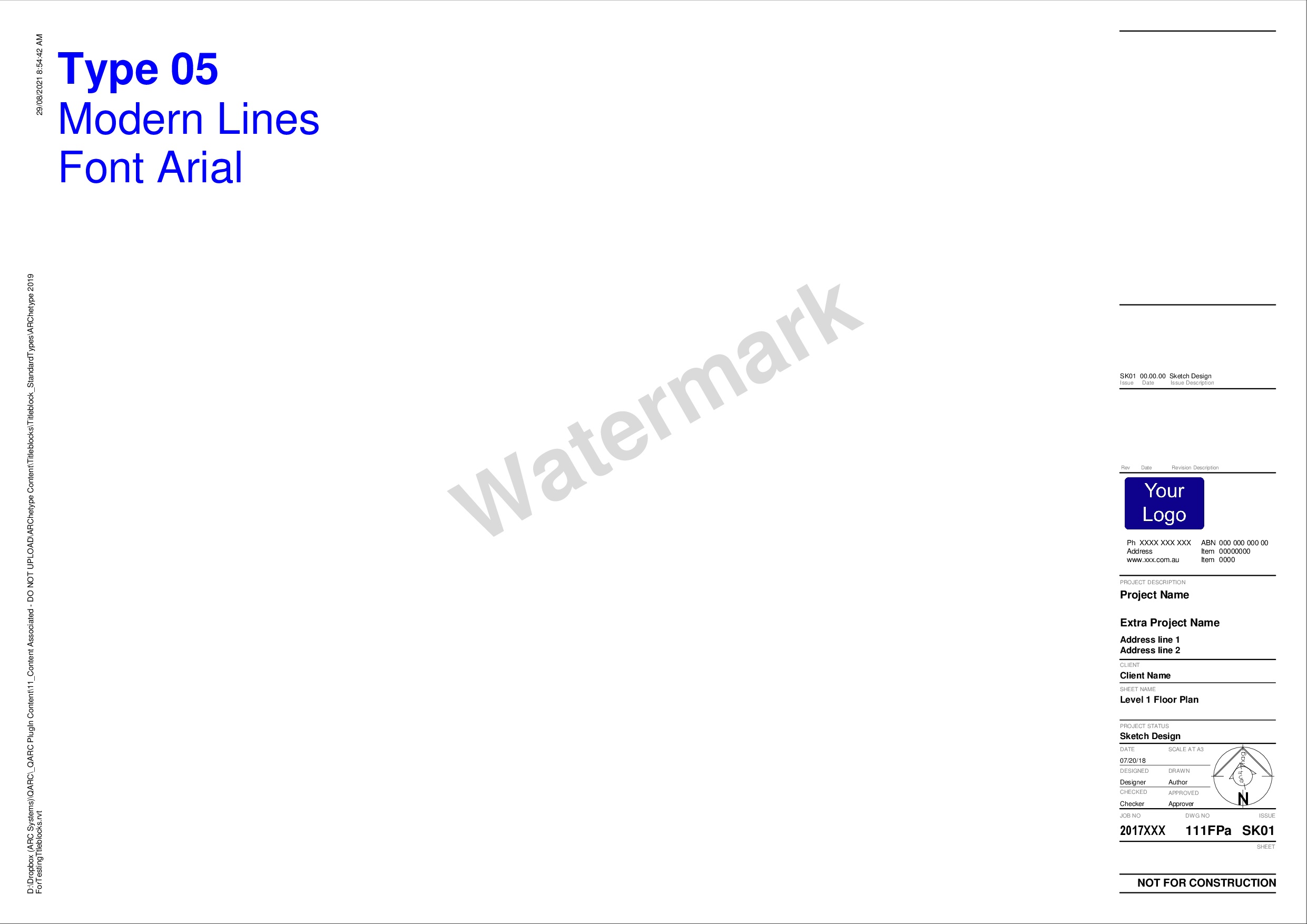 Rectangle Logo Left is used by those that prefer their info all at the bottom left. The vertical version has this at the top right. It can make your info look more discreet but in fact ensures you are noticed as it sits by itself. To the right of your info is the issue & revision blocks with the project & sheet data to the right.